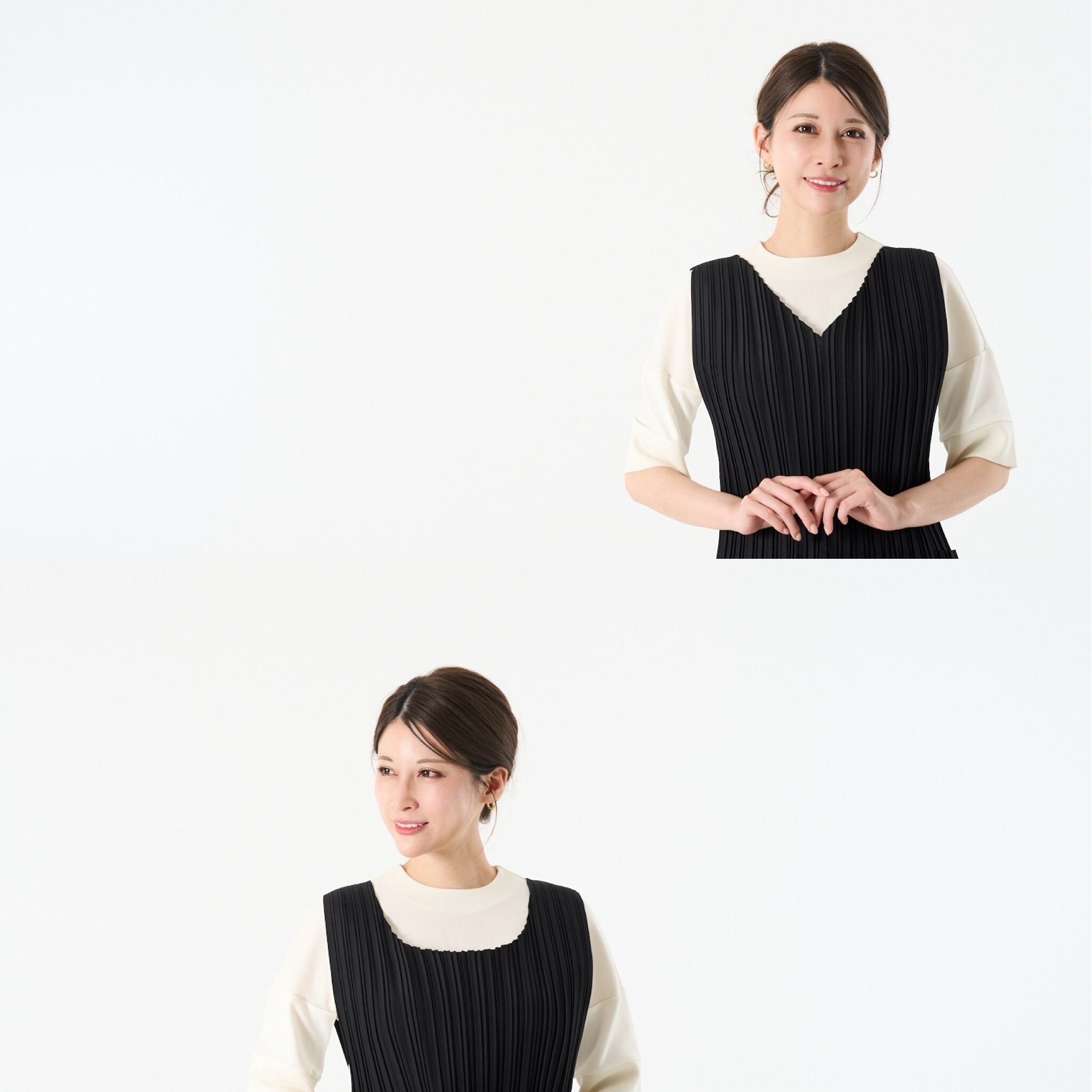 襟元がVネック・Uネックと前後2Way仕様となっており、インナー、トップス、ボトムス、アクセサリー次第で 幅広いコーディネートをお楽しみいただけ